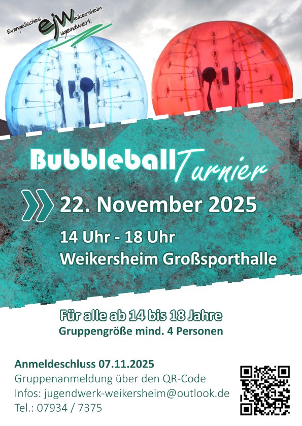 Kinderbibelwoche Weikersheim Bubbleball Turnier Termine 20.10. 19.30 Uhr BAK17.11. 19.30 Uhr BAK22.11. Bubbleball Turnier29.11. Adventsbasteln05.-07.12. Orangenaktion18.12. 19.30 Uhr BAK Alle Termine > Evangelisches Jugendwerk Bezirk WeikersheimHauptstraße 8, 97990 WeikersheimTelefon: 07934/7375E-Mail: jugendwerk-weikersheim@outlook.de© 2024 Evangelisches Jugendwerk Bezirk Weikersheim Das Evangelische Jugendwerk Bezirk Weikersheim (EJW) arbeitet selbständig im Auftrag der Evangelischen Landeskirche in Württemberg im Evangelischer Kirchenbezirk Weikersheim.Das EJW gehört zum Dachverband Evangelisches Jugendwerk in Württemberg und ist Mitglied im Kreisjugendring Main Tauber. Impressum Datenschutz